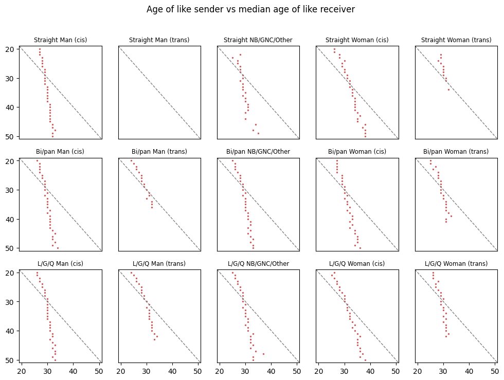 Interestingly, the ages they send likes to (in red) mostly are not at the center of their age range preferences. Young, straight, cis men send likes to people at the upper end of their range. As they get into their late 20s and early 30s, they send likes to people in the middle of their range (who are also similar in age to themselves). By the time they are in their 40s they are sending likes to people closer to the lower end of their range.