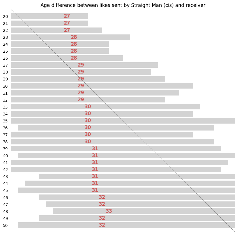 Here is the same chart for straight, cis men as before, but with their average age preferences overlaid in gray.