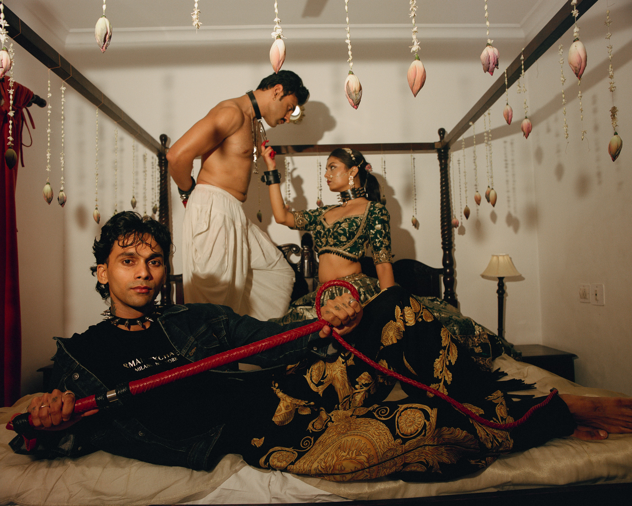 Singh is explaining the first scene of the video to the models, whose hands and feet are dyed red, a customary practice for brides on the first night of an Indian wedding. Yashashvi Soni, who is dressed in a green and gold dress with sparkly peacock-like plumage, is to whisper in Ashish Khatri’s ear: “I consent.” Next, Khatri gives Soni a turmeric milk drink (known to boost male libido), while she, in return, gives him a butt plug. “I leave a lot of things to presumption,” says Singh, “if you know, you know, if you don’t…”