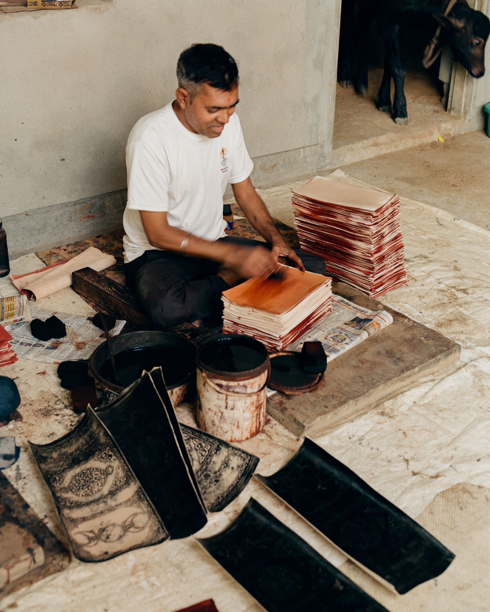 On a hot Friday afternoon in October, Randhir Singh takes a taxi from his apartment in Jaipur, leaving behind the city’s dense textile markets, its labyrinth of pink gates, forts, and palaces. He arrives an hour later in a village on the outskirts of the city—a quieter, paler landscape, where stray dogs and cattle roam wild. Pulling up outside an exposed concrete house, draped with cotton clothes strung over washing lines, Singh greets two men who sit cross-legged outside, methodically staining the leather sleeves of spell books with mahogany dye.