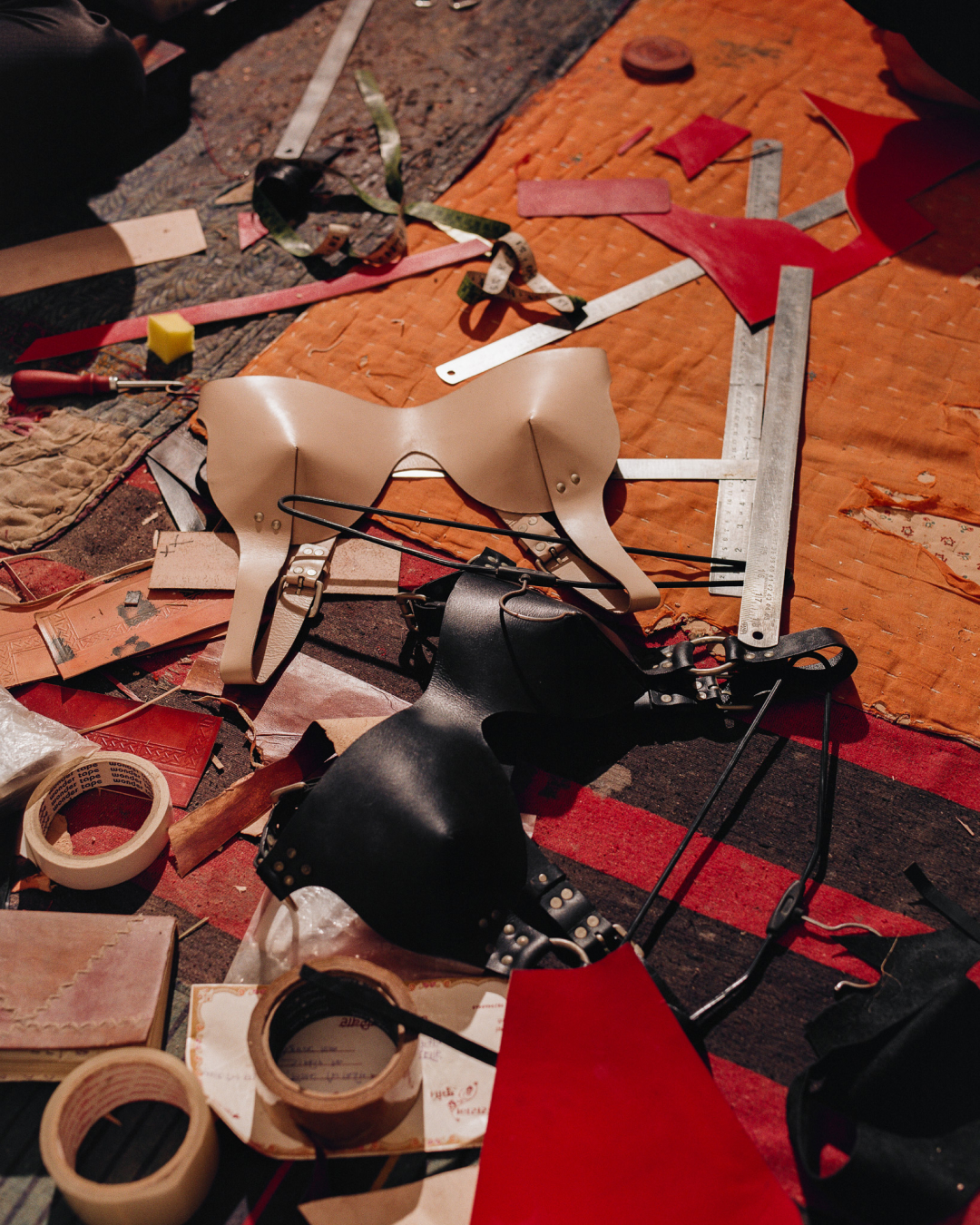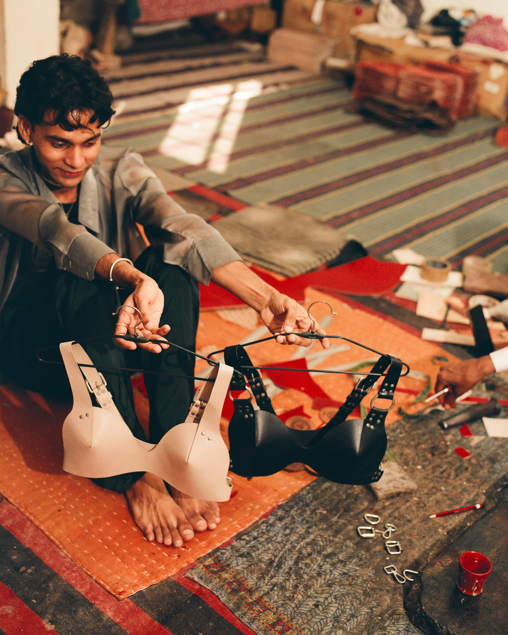 But finding a local leathermaker who was willing to make corsets and harnesses was another story. He had to try about eight leathermakers until, in the autumn of 2020, he found Anisha Enterprises. The first time he drove to the village, he felt nervous. Being “very evidently queer,” he wasn’t sure what the Atal family, who ran the company, would make of him. Singh says the Atals were initially skeptical of him too. Because of the COVID pandemic, Singh didn’t shake their hand, which, according to Singh, offended them. They thought he didn’t want to touch them because he belonged to a higher caste.
