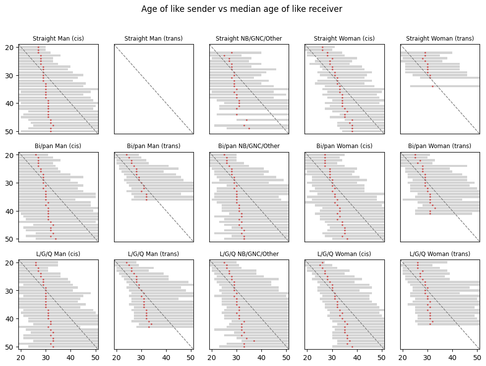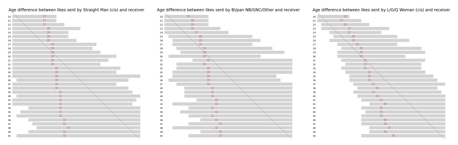 Interestingly, the ages they send likes to (in red) mostly are not at the center of their age range preferences. Young, straight, cis men send likes to people at the upper end of their range. As they get into their late 20s and early 30s, they send likes to people in the middle of their range (who are also similar in age to themselves). By the time they are in their 40s they are sending likes to people closer to the lower end of their range.