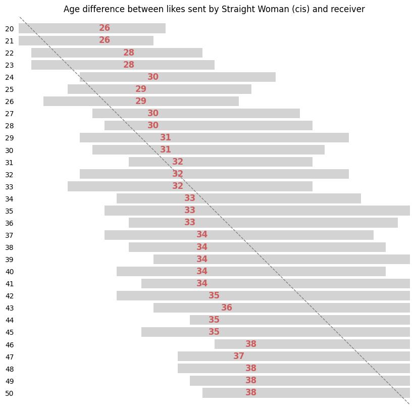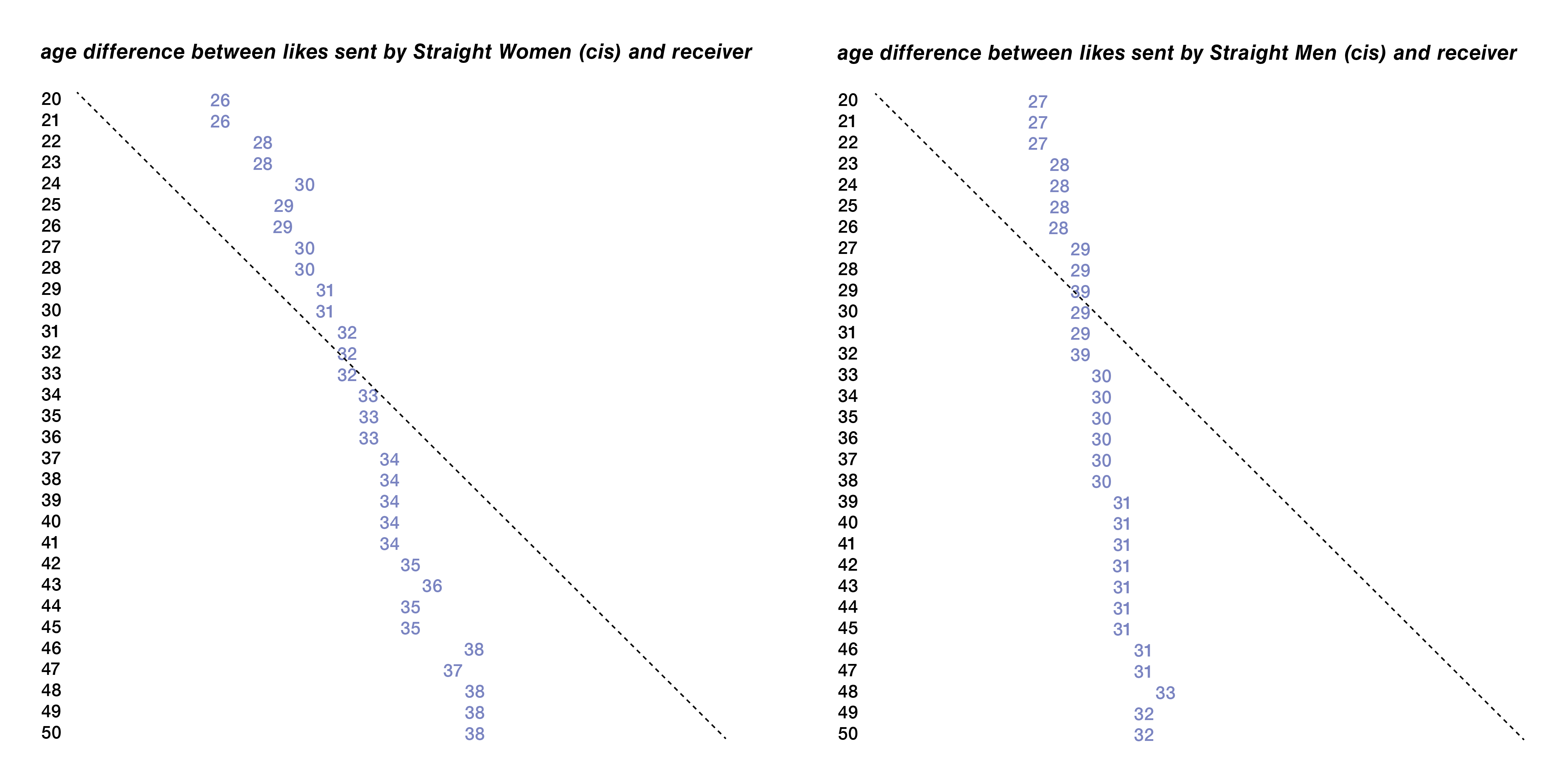 - Cis men are more stubborn about sending likes to a small band of ages around 29. Cis women, by contrast, send likes to a wider band of ages around the average of 29.