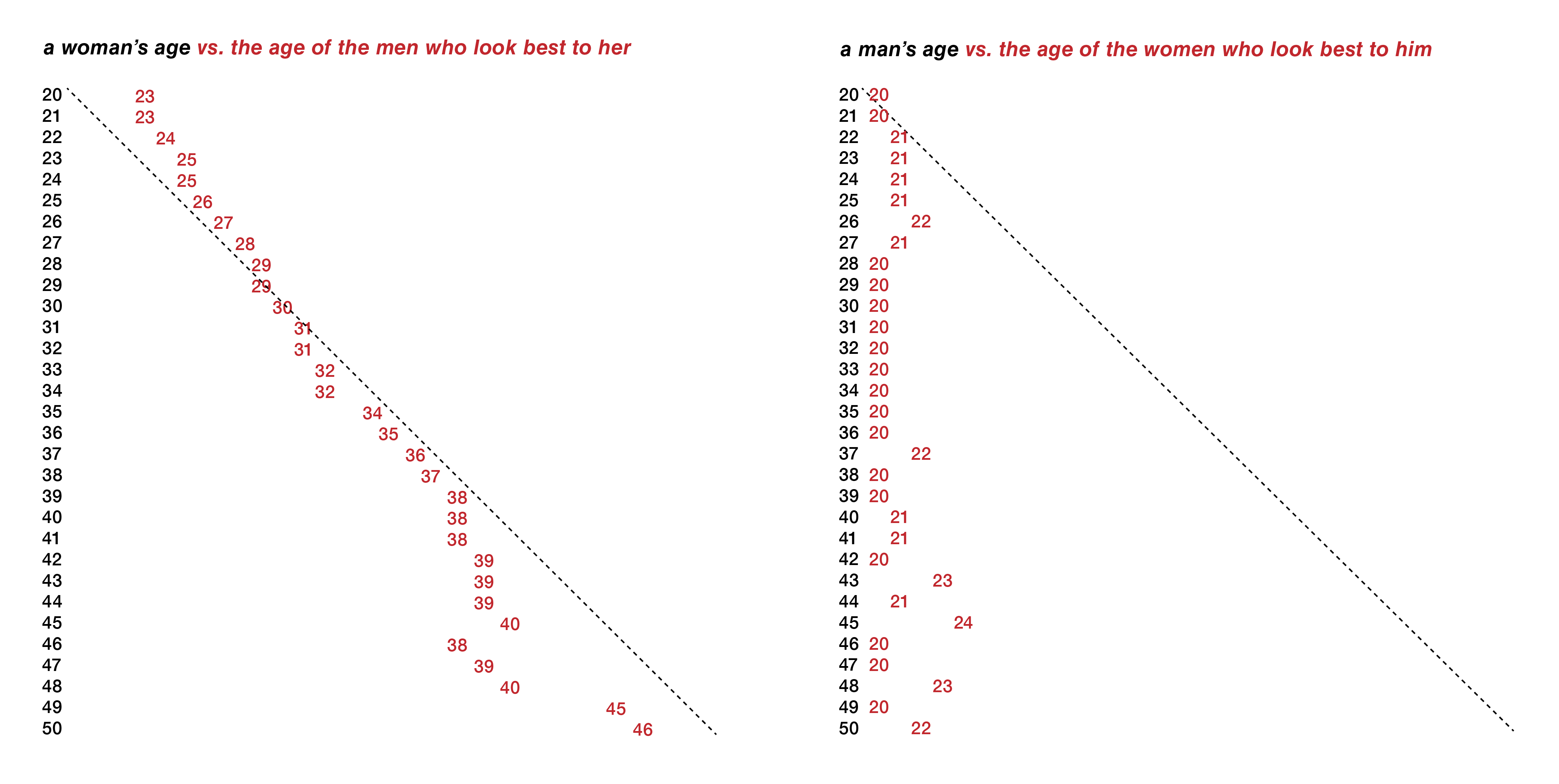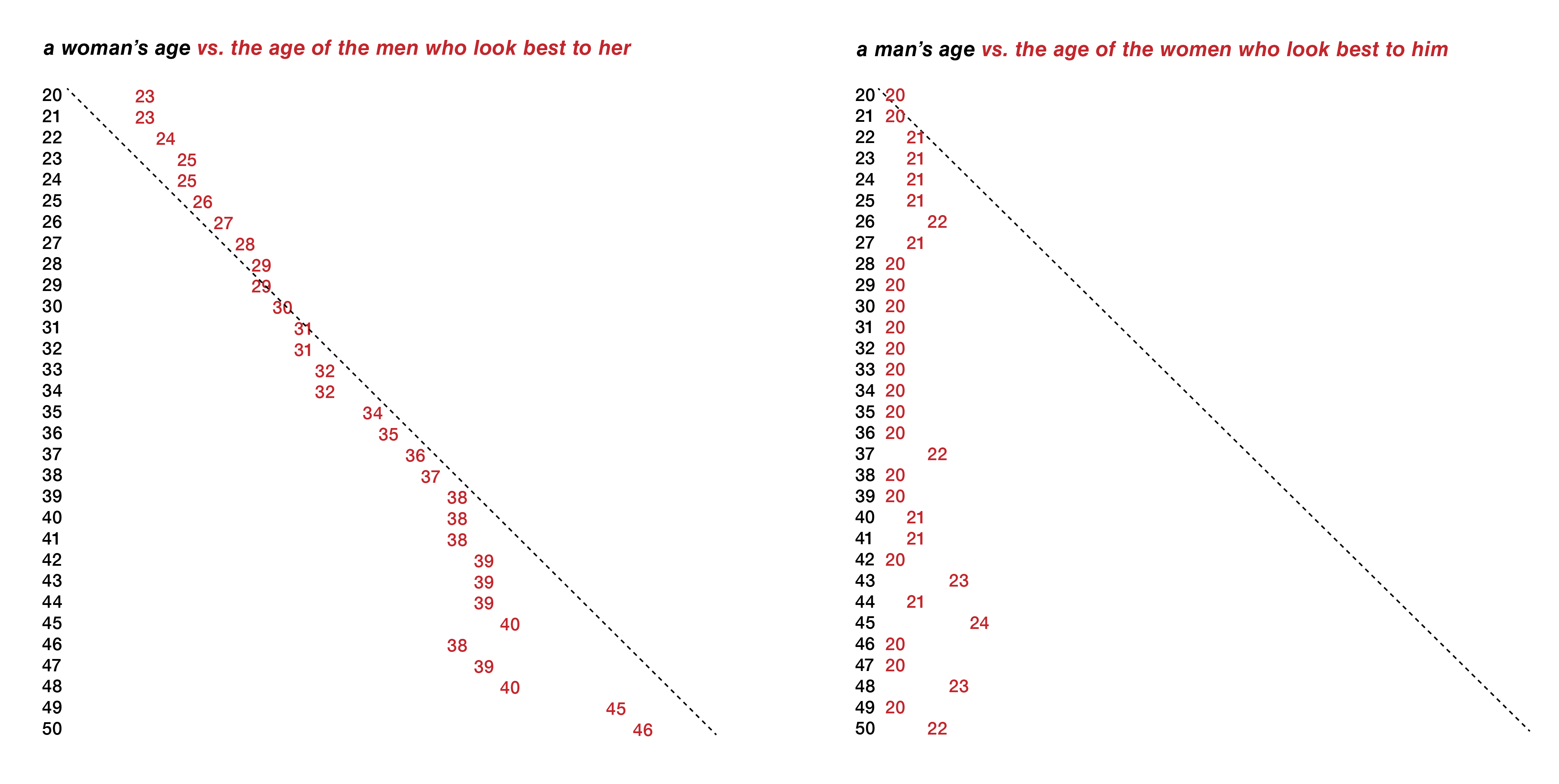 The 2014 book Dataclysm famously presented data showing that women tend to find men close to their own age attractive, whereas men tend to find primarily 21-year-old women attractive, regardless of their own age. This creates a dating disadvantage for many women because most men show less interest in them as they age.