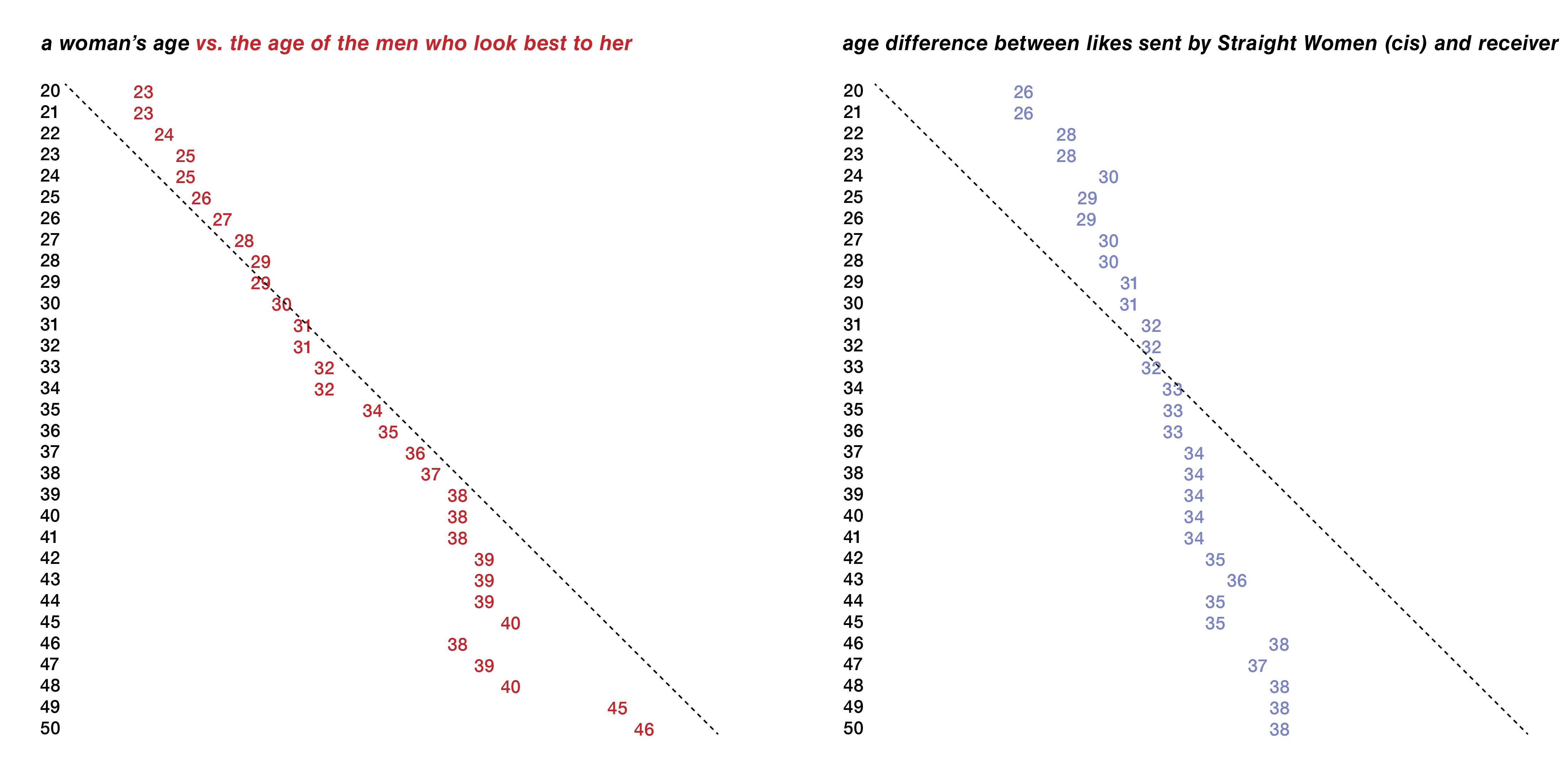 Compare the book’s findings for women on OkCupid (left) with those of straight, cis women on Feeld (right). The dotted line represents where the ages are equal.