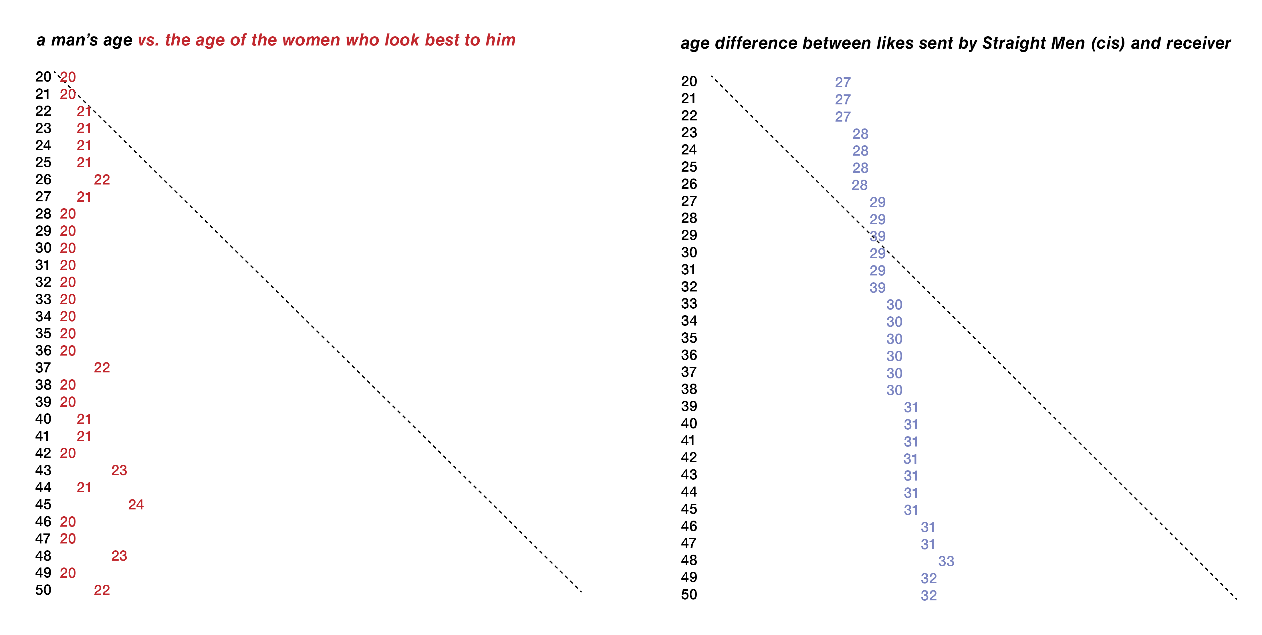 Recall the charts from Dataclysm showing extreme differences between men and women. Women follow the diagonal line (i.e. prefer men their age) while men follow a vertical line close to the left (i.e. prefer 21-year-olds regardless of their own age).