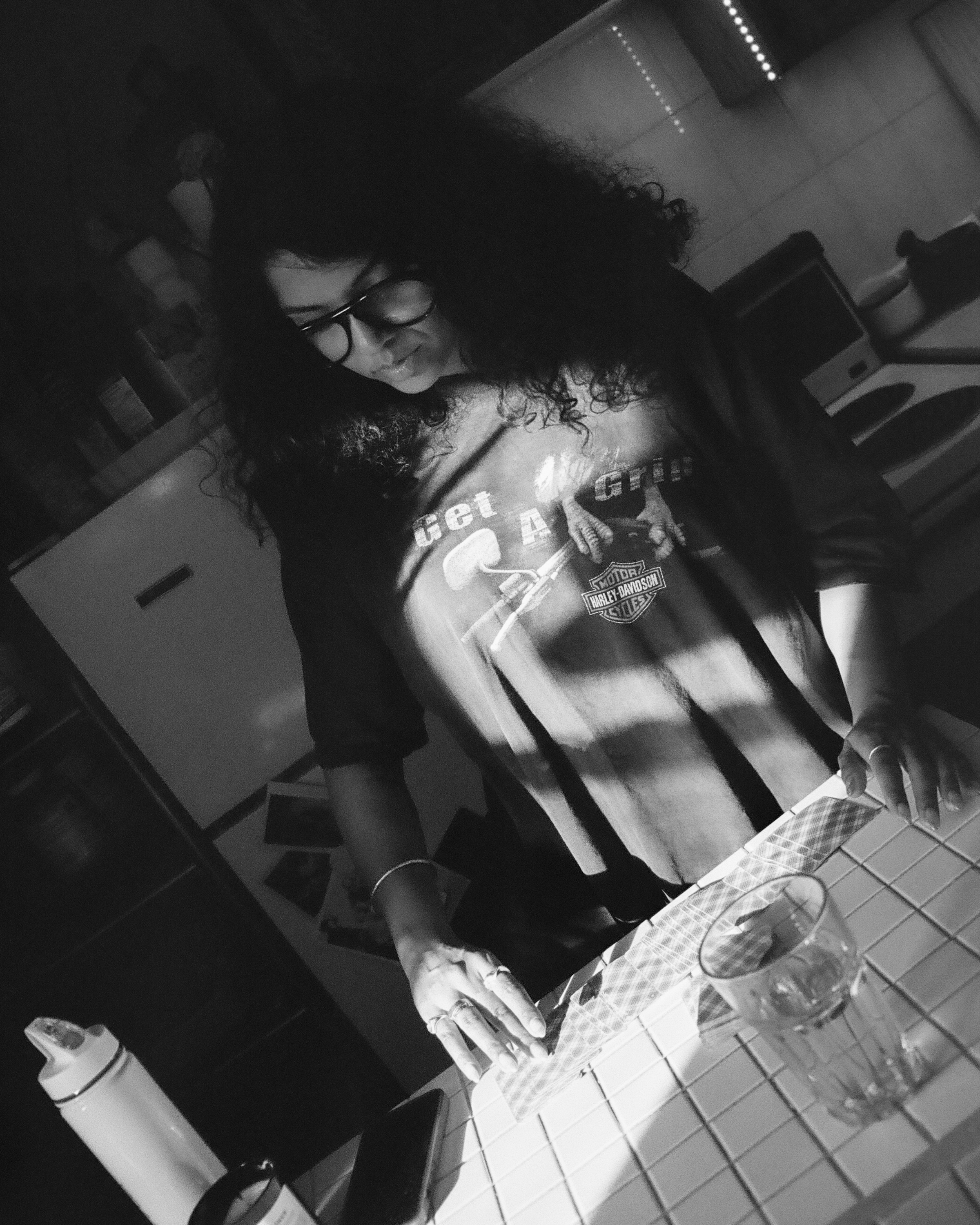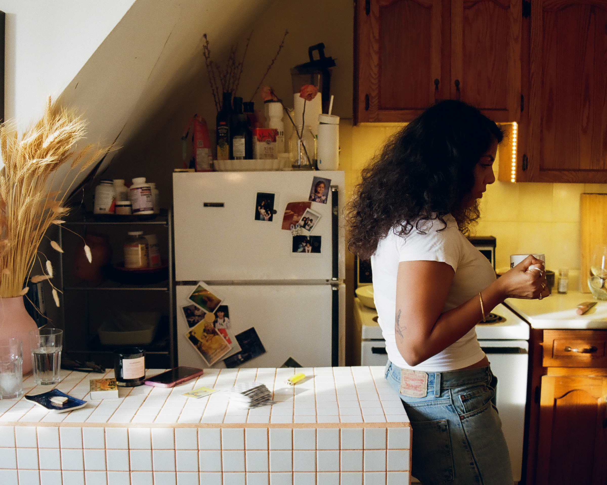 “When I’m in my own space I’m chill, but once I leave I get nervous. Sometimes I’m overthinking or too in my head. My pre-date ritual is putting on some R&B, drinking tea, lighting incense, and eating some snacks.”—Chels