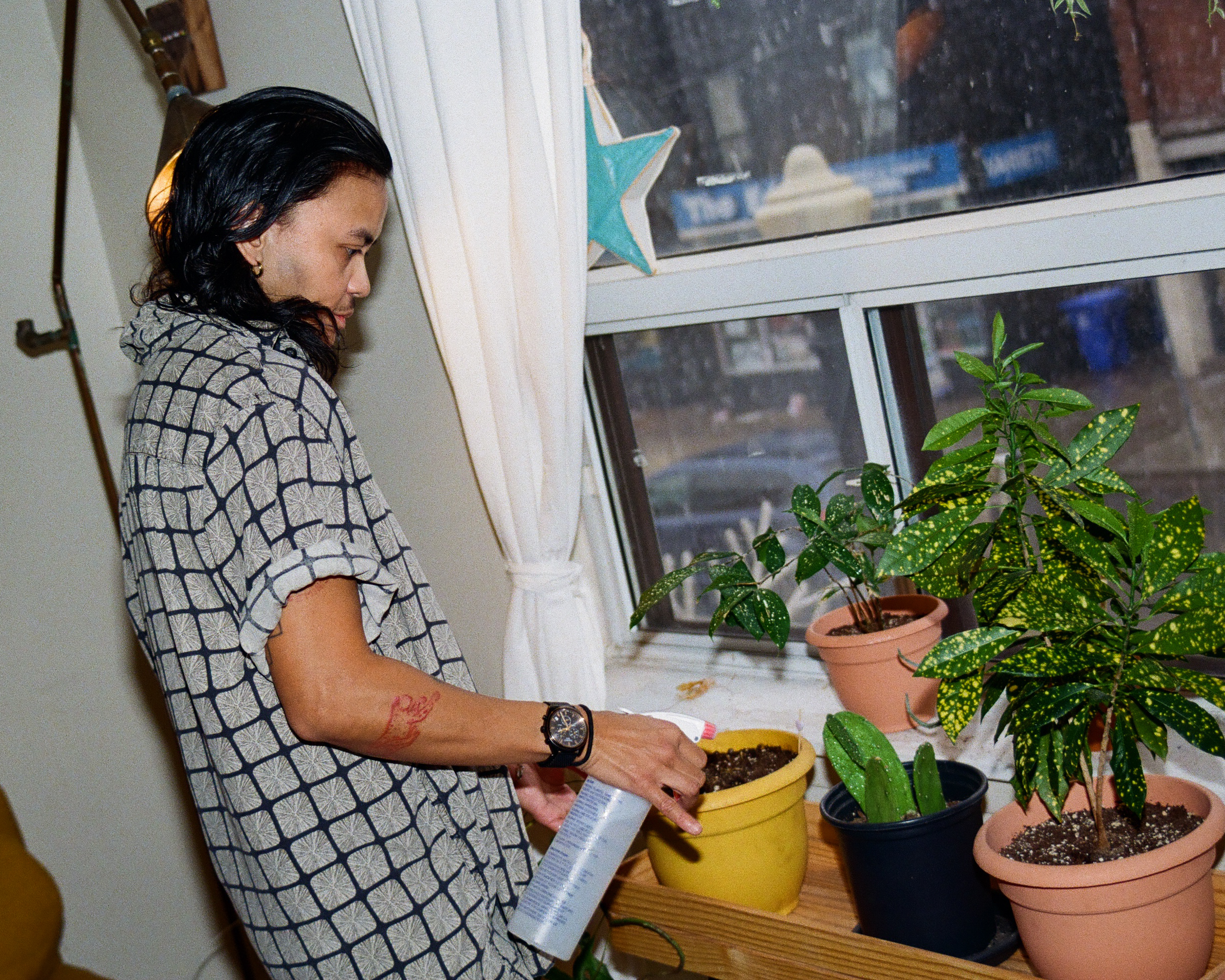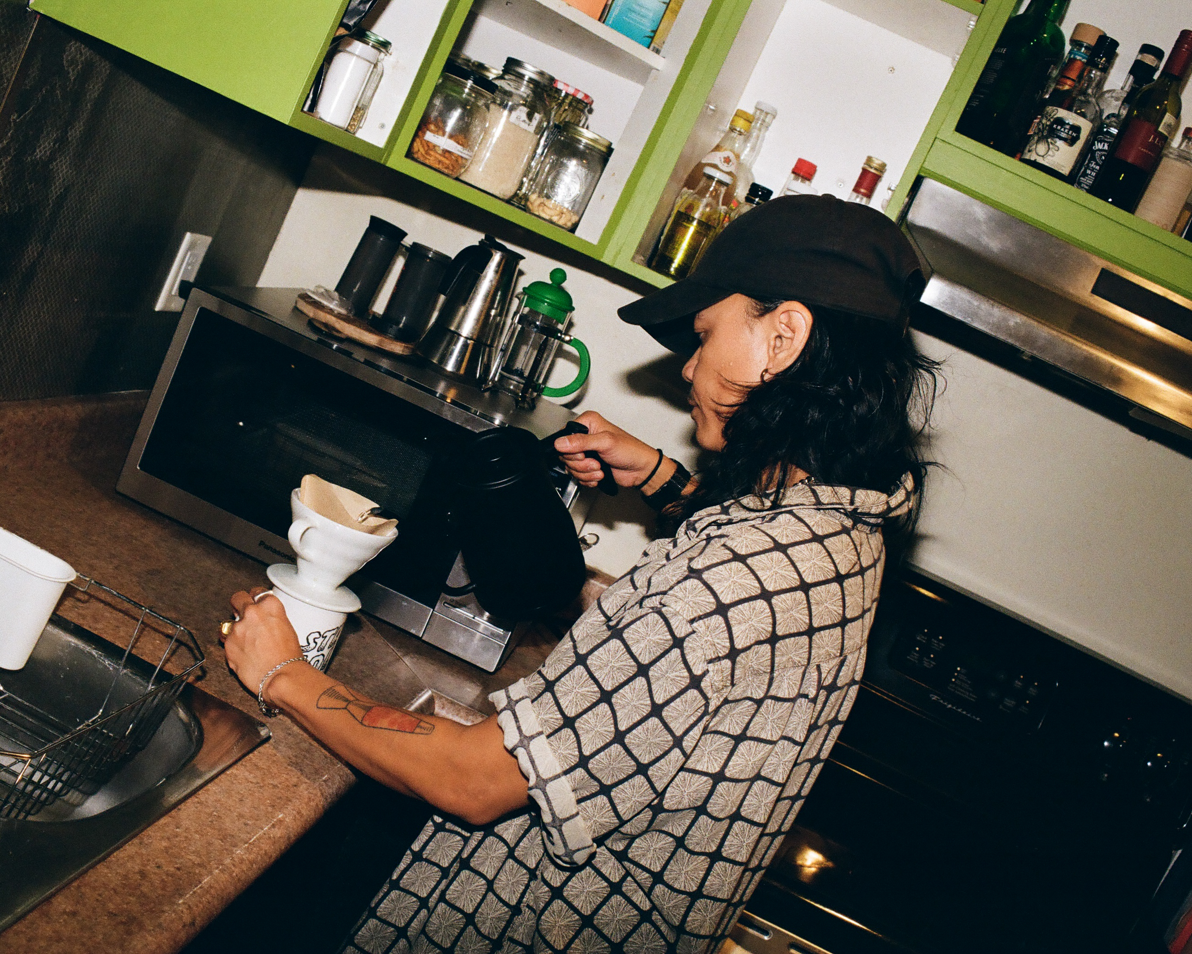 In order to shed light on the rituals of the pre-date realm, we visited six people at home in Toronto as they prepared for a date. Mel Racho arranged a date with someone new via Feeld, taking the time to decompress with some coffee and a book before heading out. Married couple Beth and Justin put on a record and lit some incense for a special date night at home. Fashion designer Tyrell Harriott caught up on Tik Tok and sought out the perfect fit for a date with a close friend. Even private moments can become powerful ways to connect with ourselves as part of connecting to each other. From universal pre-date activities like scrutinizing outfit choices, grooming, or having a drink, each person demonstrated that confidence and vulnerability can coincide.