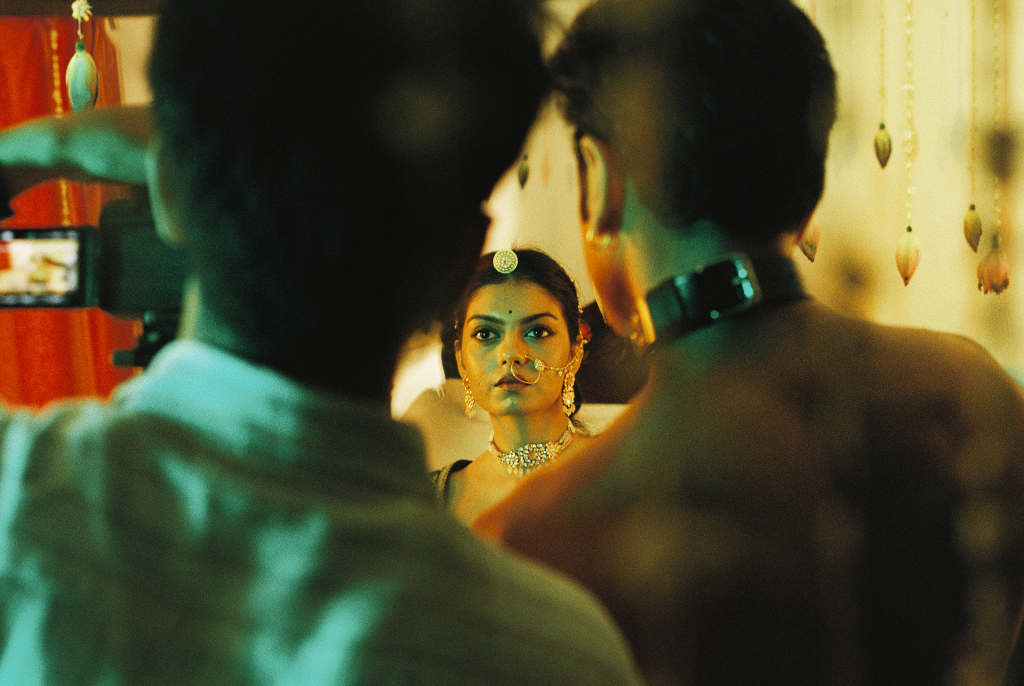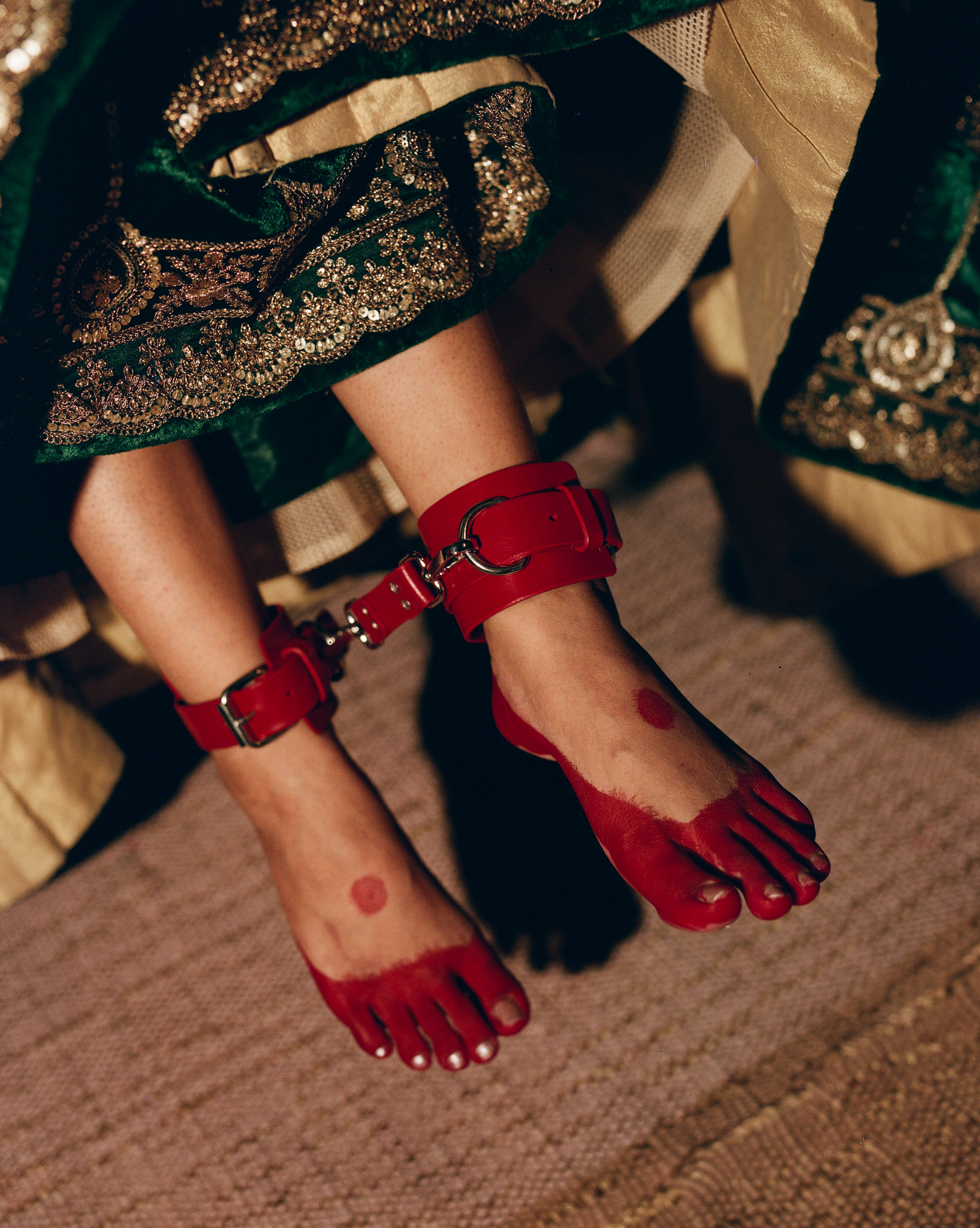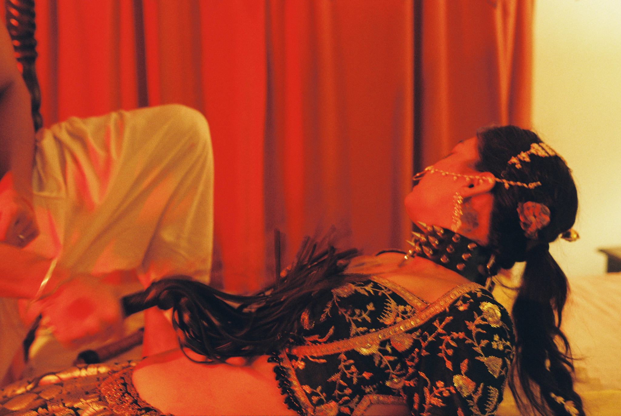 Singh is explaining the first scene of the video to the models, whose hands and feet are dyed red, a customary practice for brides on the first night of an Indian wedding. Yashashvi Soni, who is dressed in a green and gold dress with sparkly peacock-like plumage, is to whisper in Ashish Khatri’s ear: “I consent.” Next, Khatri gives Soni a turmeric milk drink (known to boost male libido), while she, in return, gives him a butt plug. “I leave a lot of things to presumption,” says Singh, “if you know, you know, if you don’t…”