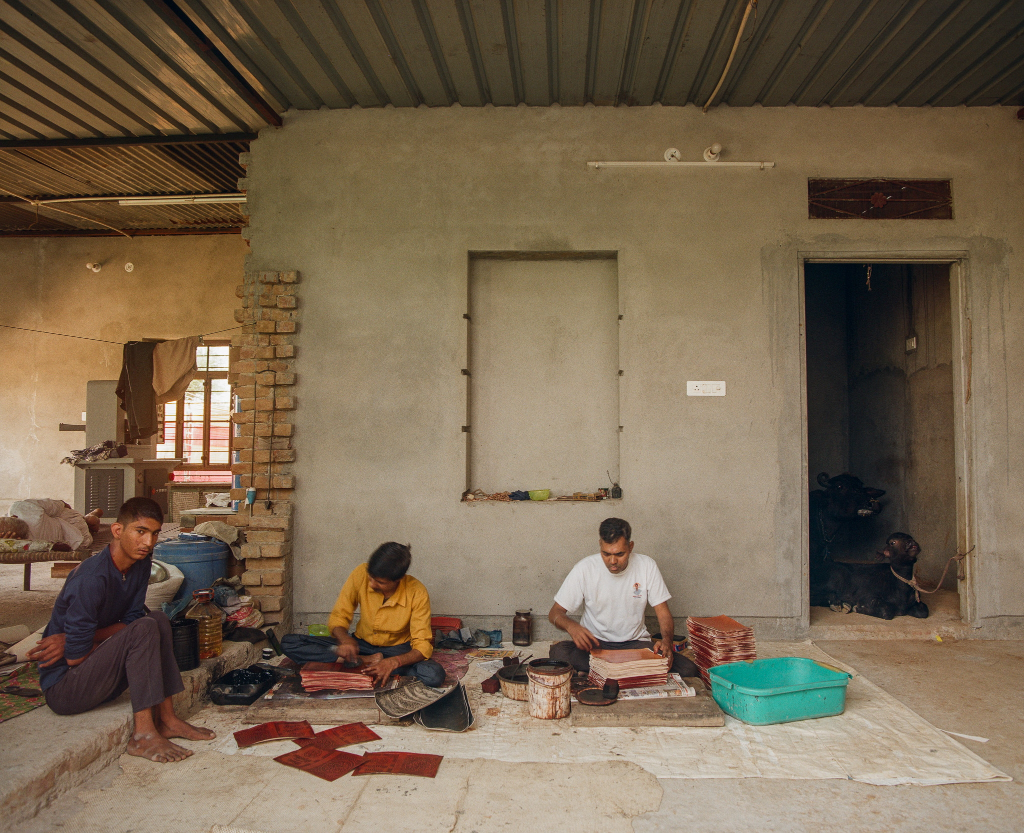 Today, Singh is sitting with Mahesh Atal, the father of the family, chatting over chai and rasgulla (a syrupy dessert ball made of milk and sugar). The two men have matching gold hoop earrings; Singh bought a pair for Atal after he complimented his own hoops. Atal, who has slick black hair and a tightly curled mustache, is making a pair of hard-leather handcuffs, using his big toe to hold down a strand of blood-red leather on a plank of wood.